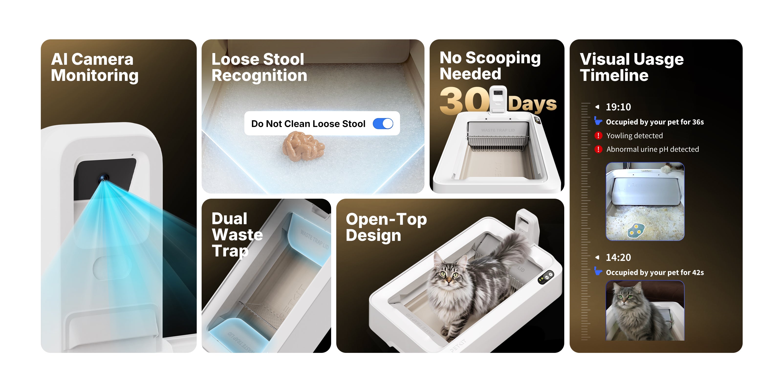 3. Phát hiện tình trạng phân: Phân lỏng ở mèo có thể do nhiều nguyên nhân, bao gồm thay đổi chế độ ăn uống, nhiễm trùng, ký sinh trùng hoặc các bệnh lý nghiêm trọng hơn như bệnh thận. Khi camera AI phát hiện phân lỏng, nó sẽ kích hoạt cảnh báo thông qua ứng dụng PETKIT. Hệ thống cào hai chiều đảm bảo vệ sinh kỹ lưỡng mà không để lại bất kỳ chất thải rắn nào. Thùng rác kép, với không gian lưu trữ rộng rãi, giúp ngăn chặn hiệu quả chất thải rắn và mùi hôi. Bật tùy chọn 'Không vệ sinh phân lỏng' trong ứng dụng và hộp vệ sinh sẽ không được vệ sinh khi camera phát hiện phân lỏng, giúp cào và hộp vệ sinh không bị bẩn và giảm nhu cầu vệ sinh kỹ lưỡng sau này.